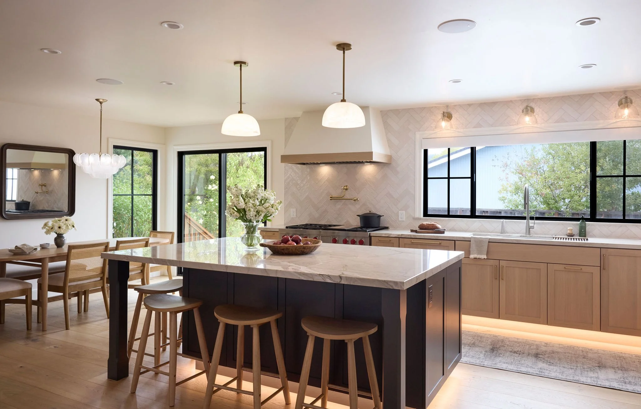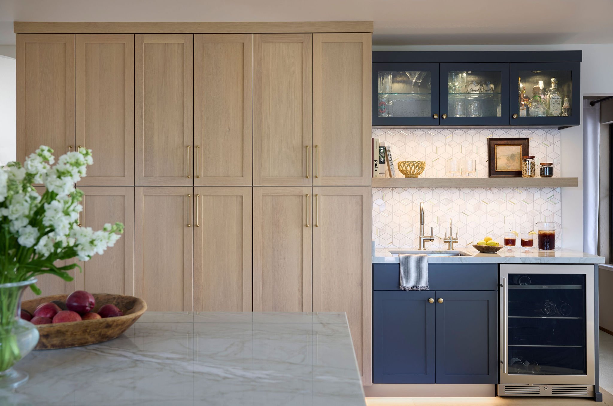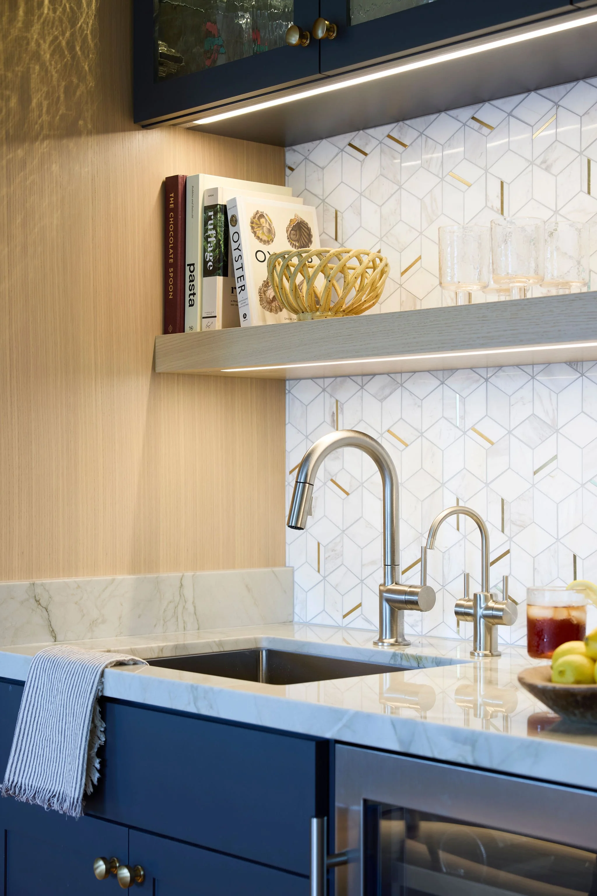 Casual elegance lives at the heart of this kitchen, where navy cabinetry and quartzite surfaces strike a refined balance. A geometric tile backsplash and glass-front cabinets elevate the bar area with texture and transparency. Light wood tones and soft gold accents warm the space, inviting both everyday ease and elevated entertaining.