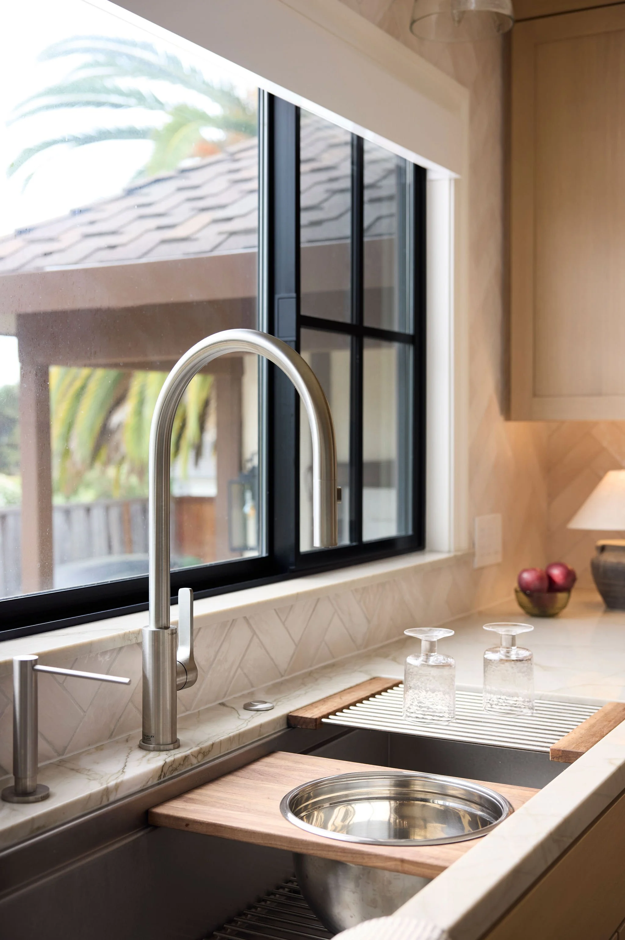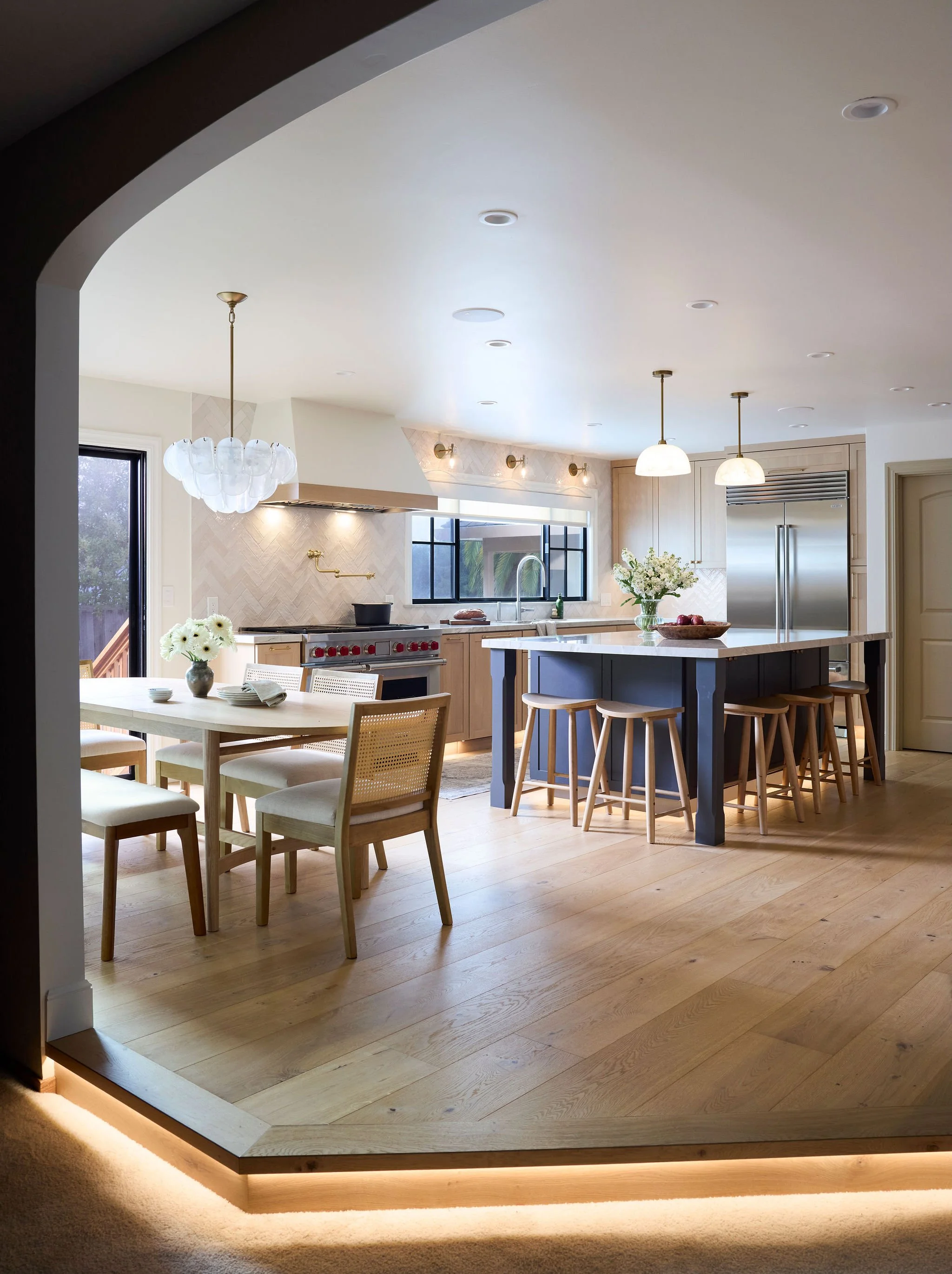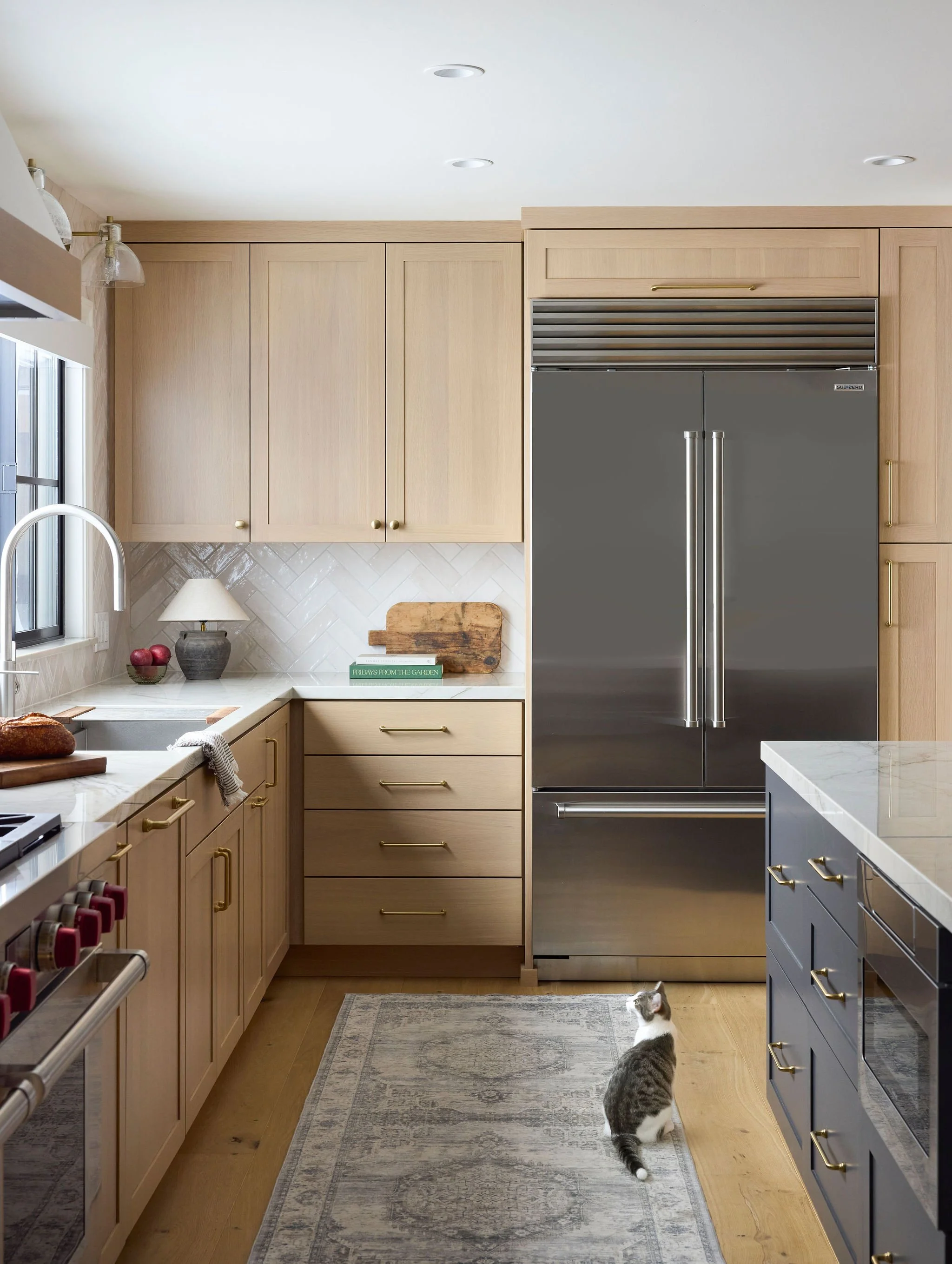 Casual elegance lives at the heart of this kitchen, where navy cabinetry and quartzite surfaces strike a refined balance. A geometric tile backsplash and glass-front cabinets elevate the bar area with texture and transparency. Light wood tones and soft gold accents warm the space, inviting both everyday ease and elevated entertaining.