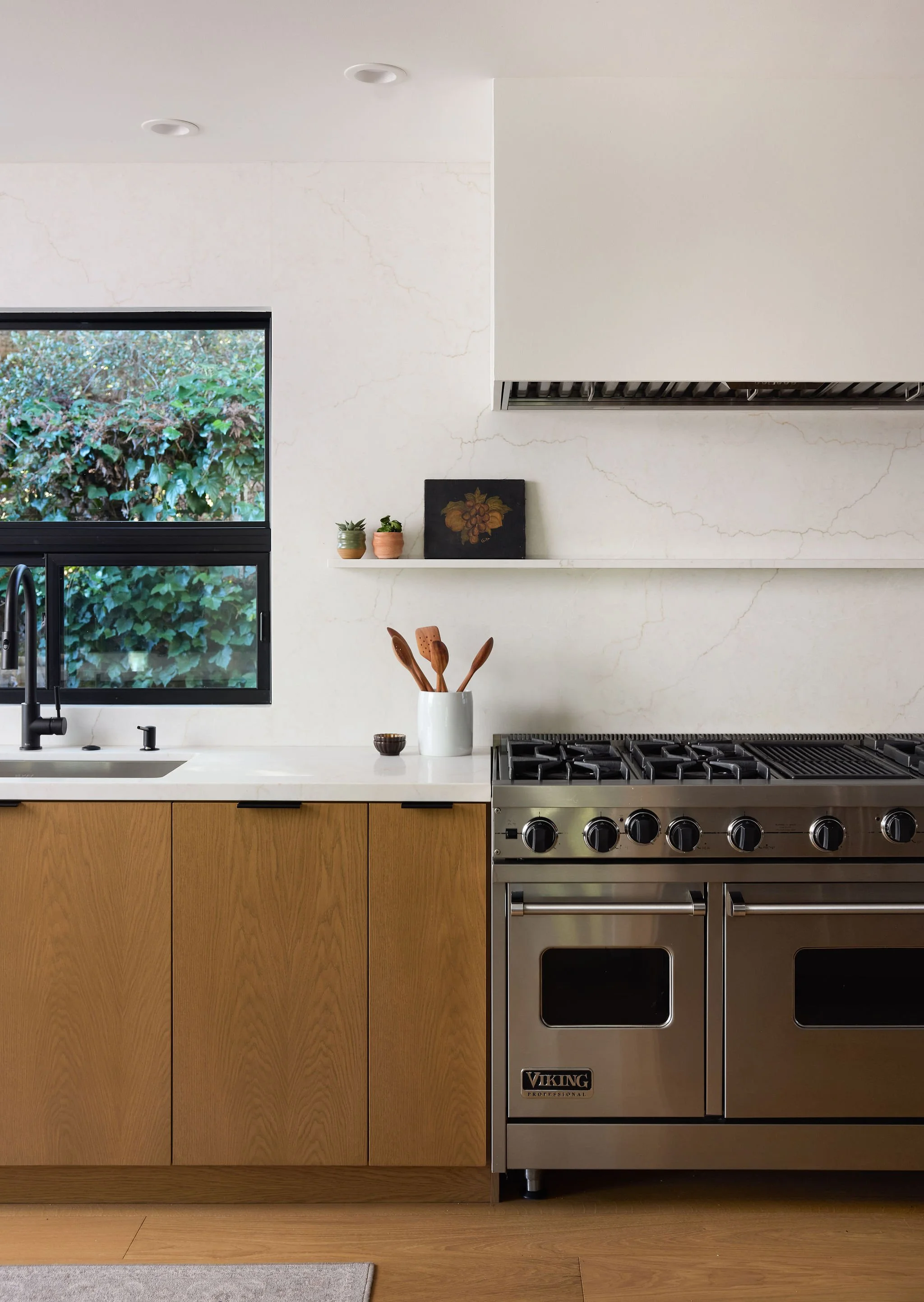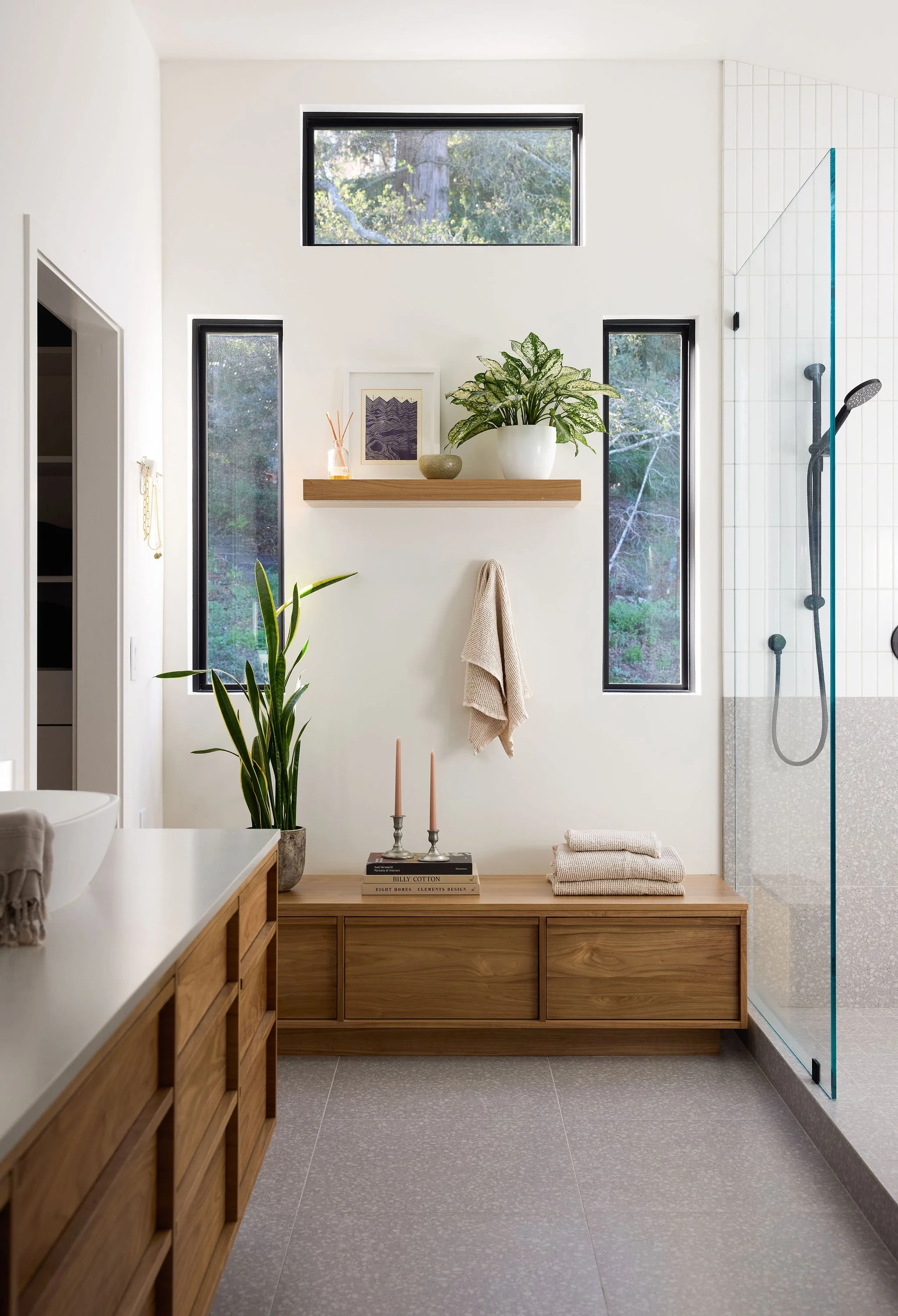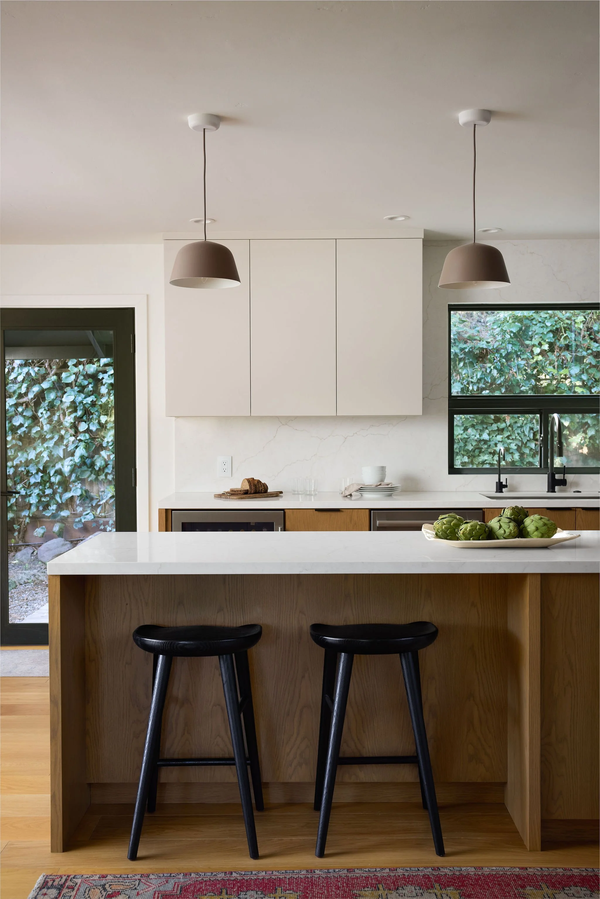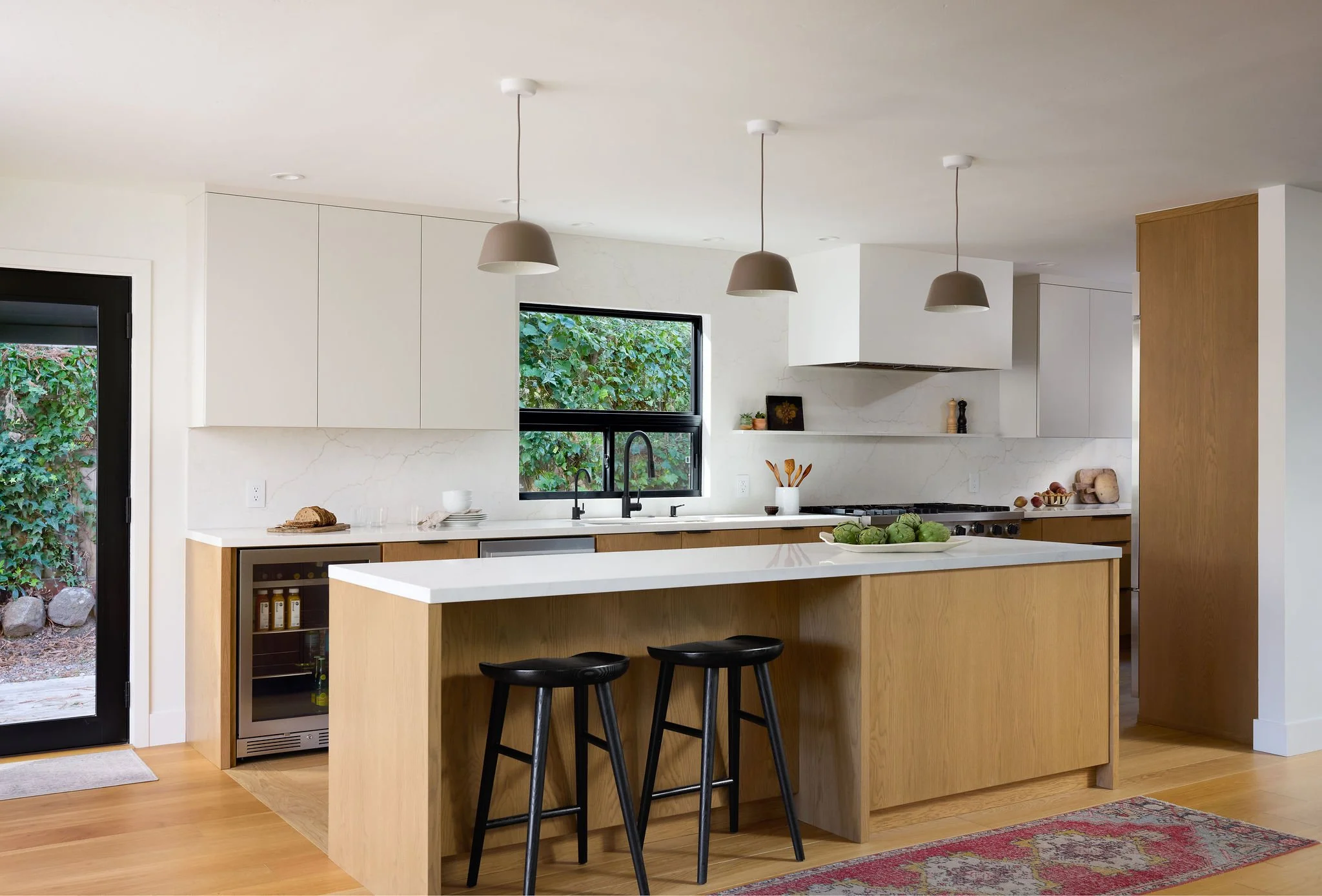 Natural light, soft wood tones, and clean-lined silhouettes create a calm, grounded atmosphere that blends Scandinavian warmth with Japanese restraint. The kitchen’s minimalist forms and organic textures feel intentional and airy, while the bathroom’s quiet palette and sculptural fixtures echo a spa-like simplicity. Together, the spaces express a refined balance of function and tranquility, inviting a slower, more mindful way of living.